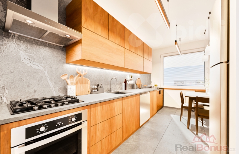 Byt zaujme velmi praktickou dispozicí, kde všechny pokoje jsou neprůchozí, což je ideální pro vícečlennou rodinu. Dominantou bytu je světlý obývací pokoj s velkým balkonem, ze kterého si můžete užívat krásné výhledy na západy slunce. Kuchyně je prostorná a vybavena vestavěnou linkou na míru (r. 2012) včetně spotřebičů. Varná deska je kombinovaná na indukci a plyn, obojí lze požívat současně.