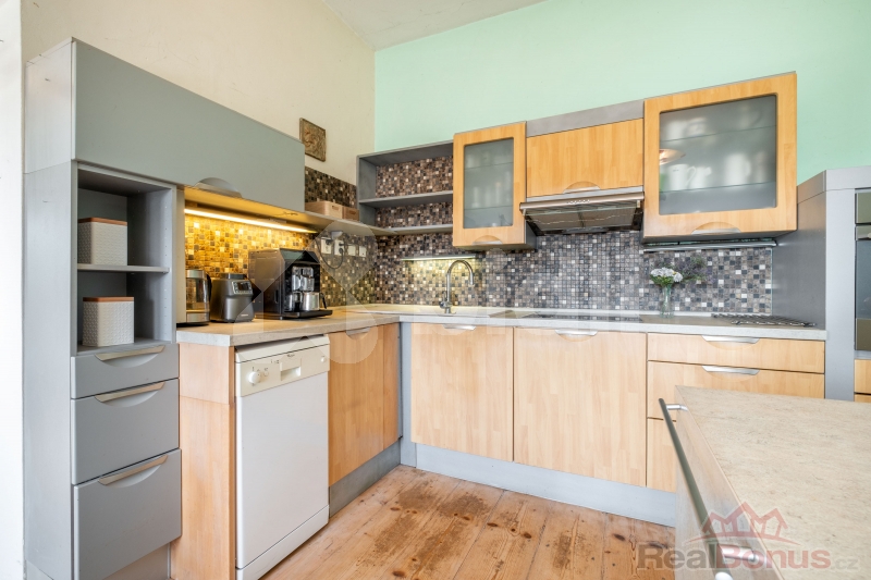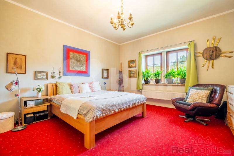 Momentálně dům je využíván z poloviny na bydlení, kde získáte zrenovovaný obytnou část s prostornou kuchyní, spojenou s jídelním koutem a obývací částí. Dále ložnice s krásnou knihovnou, vlastní větší šatna, koupelna s vanou včetně WC, vstup na menší balkón vám nabídne krásný pohled do udržované zahrady.
