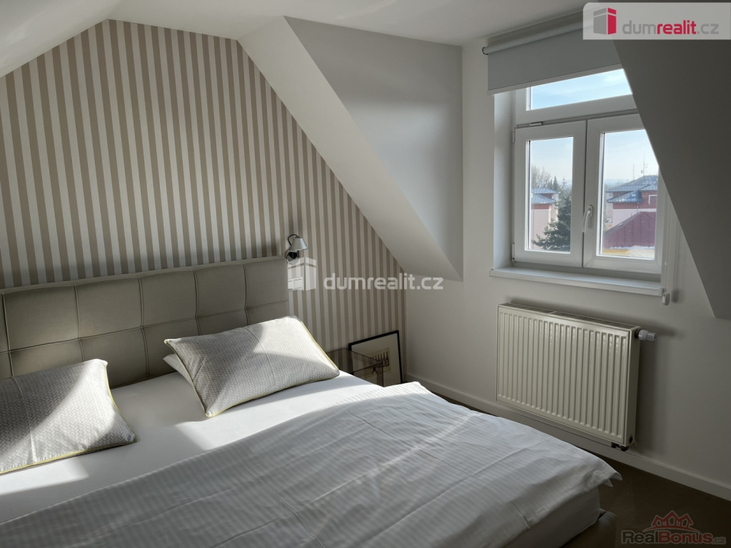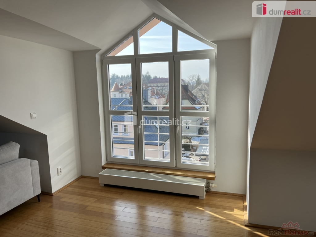 informace v realitní kanceláři, Dumrealit.cz Vám zprostředkuje pronájem nádherného, atypického bytu vel. 3+kk/B s osobním výtahem, parkovacím stáním a balkonem s výhledem na lesy a městský park v klidné ulici v centru Mariánských Lázní. Byt se nachází v 4. podlaží cihlového domu (Villa Roth) a jeho plošná výměra činí 140 m. Tento mezonetový byt disponuje vlastním osobním výtahem, který je k dispozici pouze tomuto bytu. Výtah Vás doveze přímo do bytové jednotky.