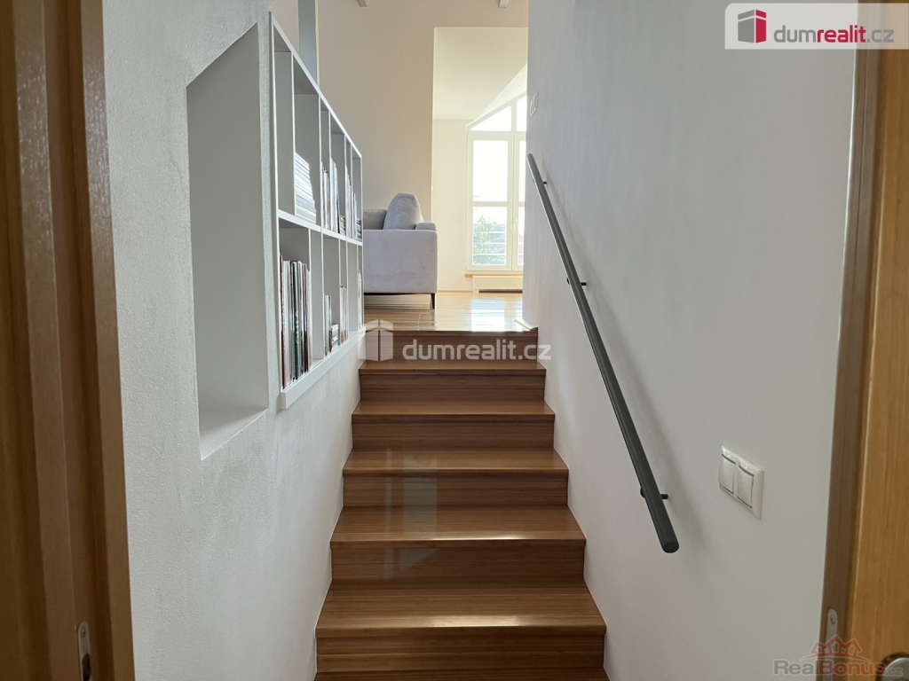 Další pokoj je přístupný z předsíně kdy se po schodech vchází do otevřeného prostoru s výrazným oknem, prostorný pokoj, který rozdělen na část s pracovnou a knihovnou a dále na další ložnici. V této části bytu je k dispozici druhá koupelna se sprchovým koutem, umyvadlem a toaletou.