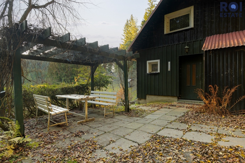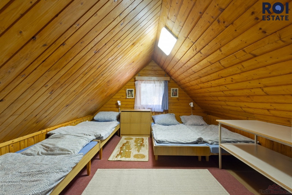 V přízemí se nachází útulný obývací pokoj s krbovými kamny se schodištěm do podkroví, dále kuchyně s elektrickým sporákem, koupelna, WC a také prostorná sauna. V patře pak najdete dva prostorné pokoje s krásným výhledem do okolní přírody. O vytápění se starají kamna na tuhá paliva, která spolehlivě vyhřejí celý objekt. Voda je čerpána z vlastní studny a ohřev zajišťuje elektrický bojler. Odpady jsou svedeny do jímky.