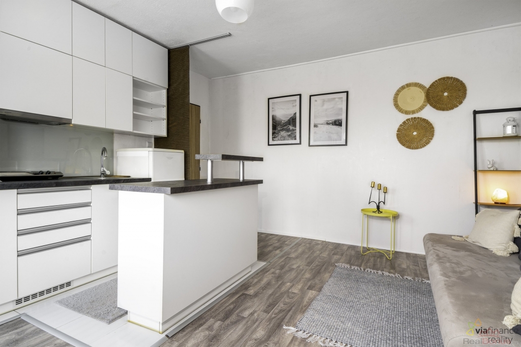 Byt se nachází v 5. nadzemním podlaží panelového domu s výtahem a nabízí promyšleně řešený prostor, který působí útulně a zároveň velmi funkčně. Dispozice zahrnuje vstupní chodbu s vestavěnými úložnými prostory, koupelnu se sprchovým koutem a hlavní obytný prostor s kuchyňským koutem a oddělenou částí na spaní.