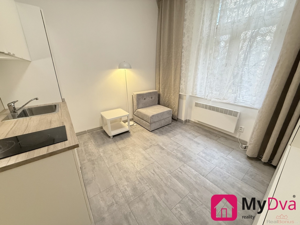 Byt nabízí moderní, čistý prostor připravený k okamžitému nastěhování. Dominantou je obytná část s kuchyňským koutem, který je vybaven kuchyňskou linkou, varnou deskou a dřezem. Díky velkému oknu je místnost příjemně prosvětlená a působí vzdušně.