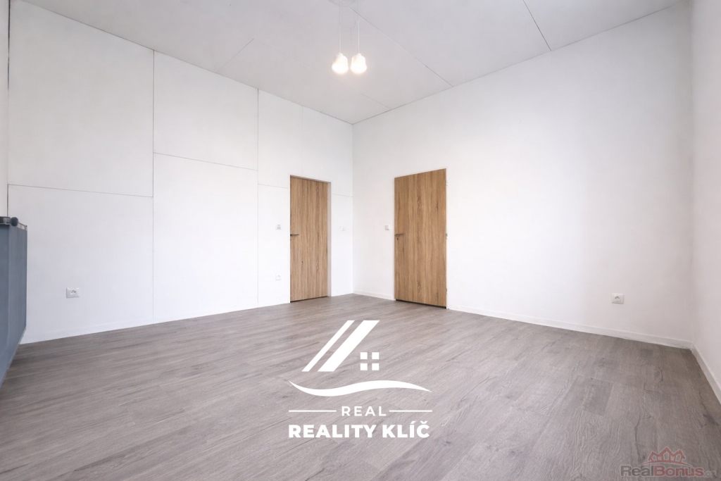 Dominantou bytu je velkorysý obývací prostor s kuchyňským koutem, který zaujme přiznaným cihlovým zdivem, vysokými stropy a velkým oknem, díky kterému je místnost krásně prosvětlená po celý den. Prostor působí velmi otevřeně a nabízí dostatek místa jak pro obývací část, tak i jídelní zónu.