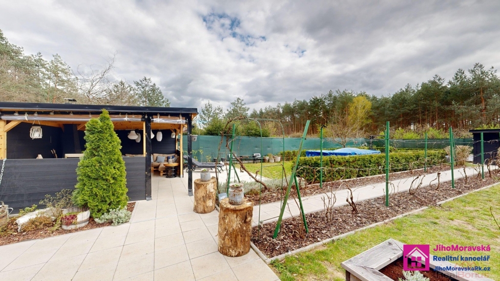 Součástí prodejní ceny je následující vybavení: Pergola s krbem a zástěnami s paletovým posezením, matracemi, stolem z palet a skla. Dvě venkovní boudy. V první je úschovna na kola plus malý sklep a ve druhé keramické wc, kamenné umyvadlo a sprchový kout na solární sprchu. Zelená maringotka pro úschovu nářadí atd. 5x vyvýšené záhony, nadzemní bazén s příslušenstvím, trampolína, dětský domeček s terasou. Velká terasa s levandulemi, stůl a paletové posezení s matrací a šicím strojem na boty jako stoleček. Veškeré solární osvětlení zahrady a dva bečáry na dešťovou vodu.