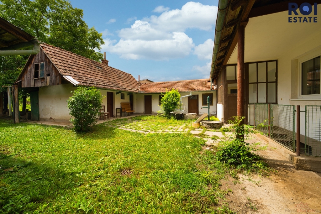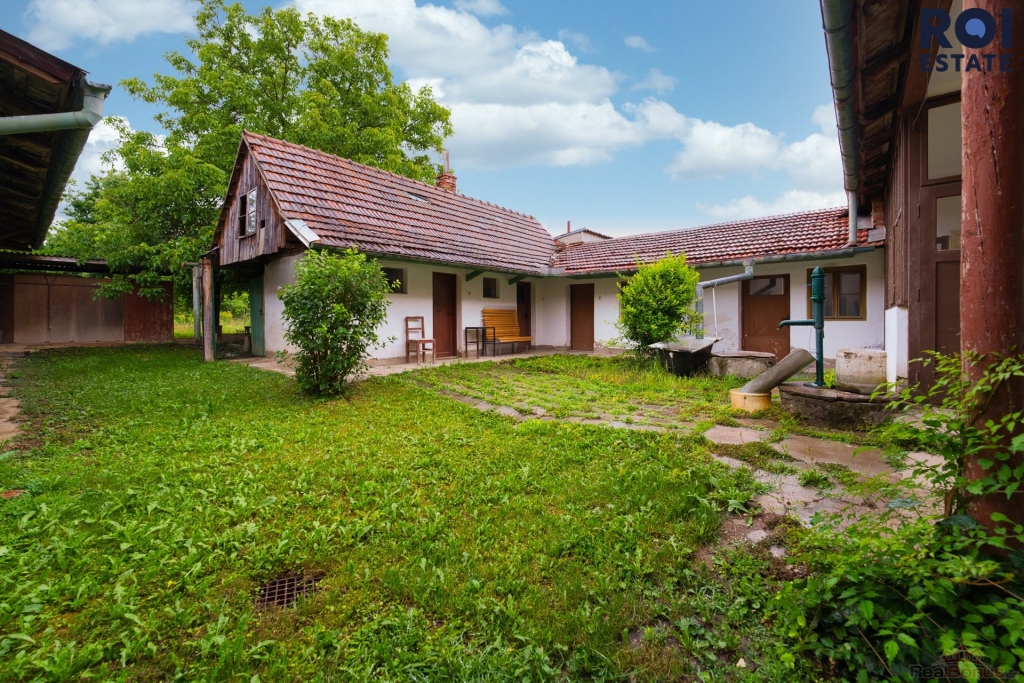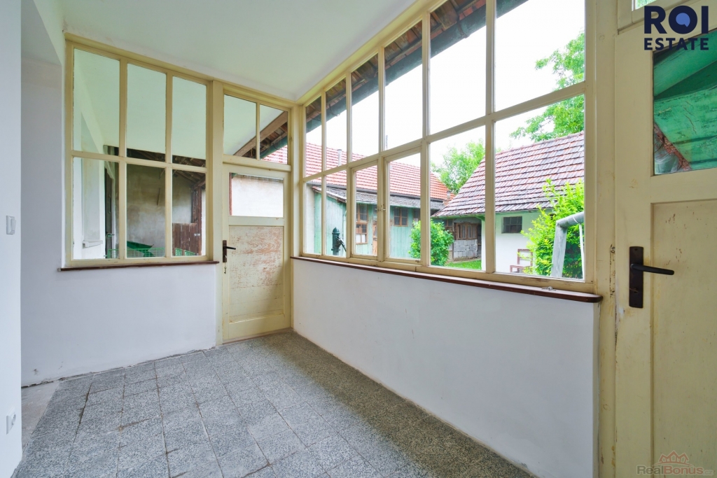 Z interiéru se vchází na zasklenou verandu, ideální třeba pro ranní kávu. Odtud je přístupná i komora, kterou můžete využít jako praktickou spíž. Následuje dvůr, kde se nachází několik dalších místností v původním stavu ? přímo vybízejí k tomu, aby se z nich stala letní kuchyně, dílna, prádelna nebo prostor pro tvoření. Dům je částečně posklepený.