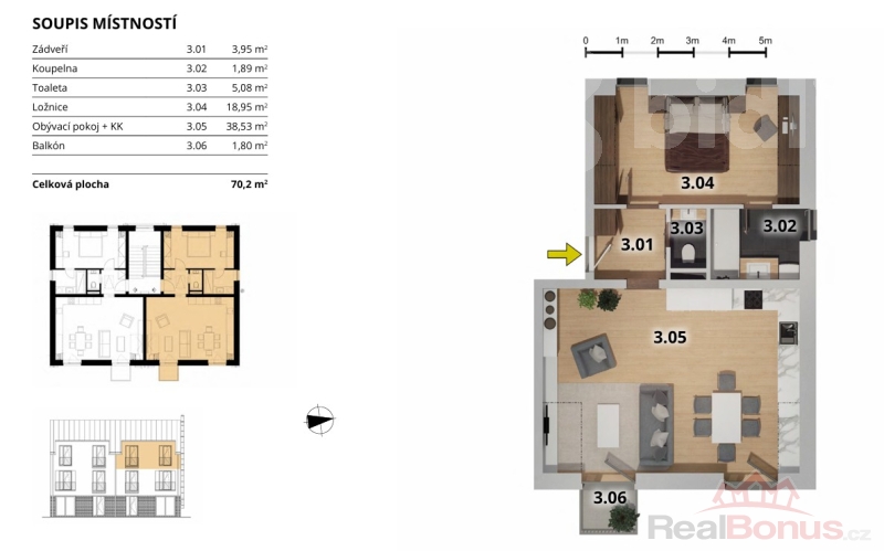 Užitná plocha bytu je 68,4 m2 bez balkonu a dohromady tvoří 70,2 m2.