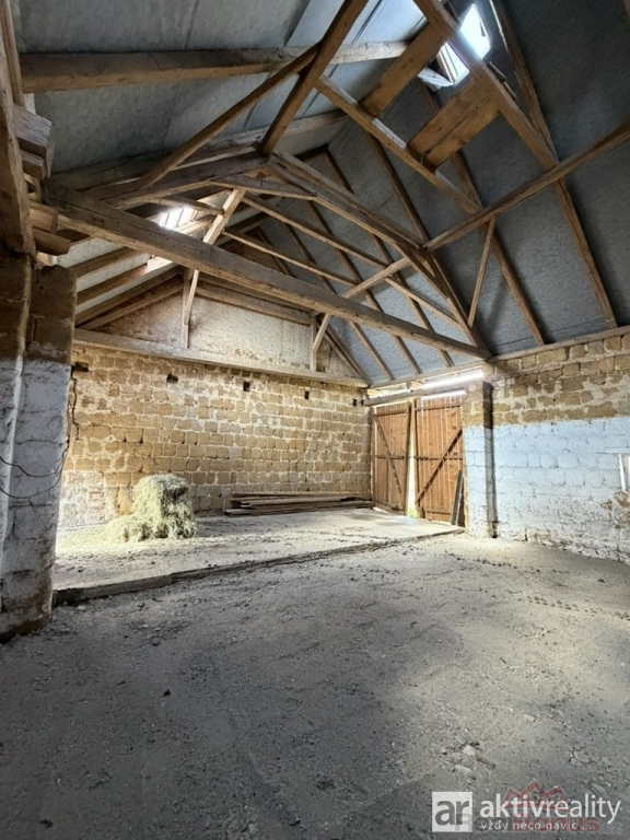 Naproti obytné části se nacházejí dvě hospodářské budovy ? menší a větší chlévy, které jsou v dobrém technickém stavu. Větší chlév má přibližně 320 m2, menší okolo 35 m2. Obě stavby mají pevné zdivo, jsou suché a stabilní, a nad nimi se rozkládá rozsáhlý půdní prostor vhodný pro skladování nebo další využití. Na stodolu dále navazuje vysoký otevřený přístřešek o ploše přibližně 122 m2, který nabízí další prostor například pro techniku či materiál.