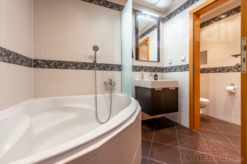 Součástí vybavení je kuchyňská linka s vestavěnými spotřebiči, plovoucí podlaha, dlažba, plastová okna, bezpečnostní dveře a zabezpečovací zařízení.