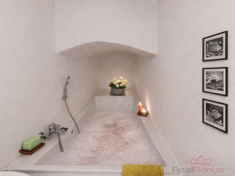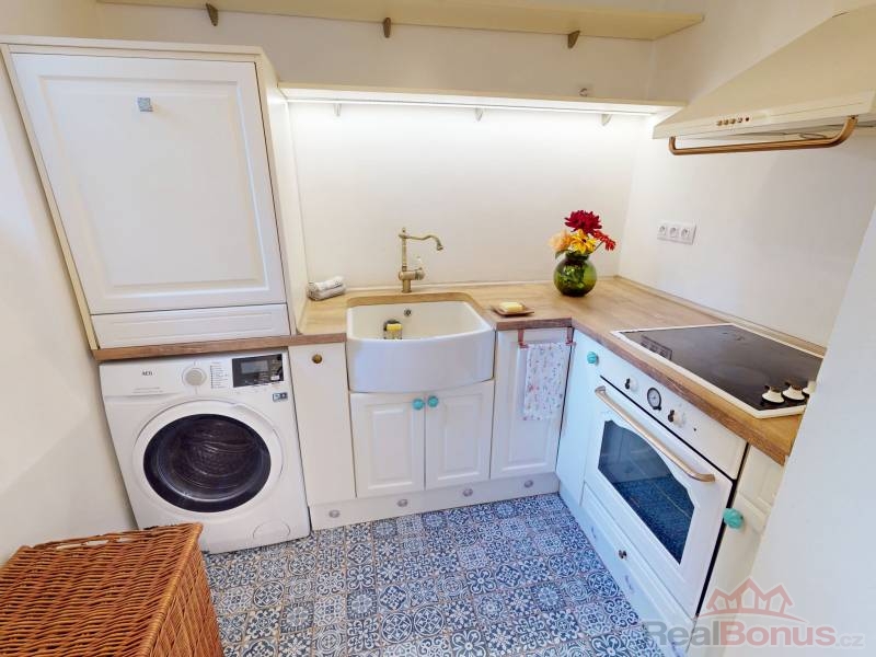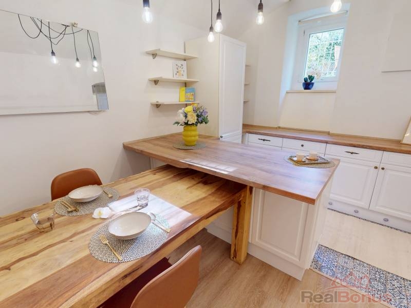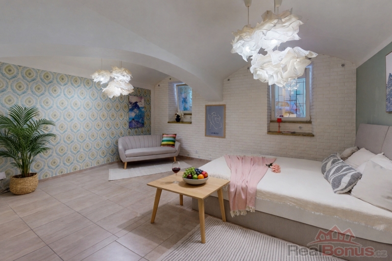 Z chodby vcházíme do velkorysého obývacího prostoru (28 m2) s klenutými stropy, jenž je aktuálně ložnicí s obývací částí, je však možnost jej přepažit a docílit tak dvou samostatných pokojů. Pokračujeme do prostoru s kuchyní a jídelnou (kuchyňská linka s ostrůvkem včetně vestavěných spotřebičů) komunikující se zahradou osvětlenou odpoledním sluncem. Samostatným vstupem z chodby se přesouváme do originálně řešené útulné koupelny, či na samostatné WC. Byt disponuje též praktickou šatnou a úklidovou komorou.