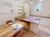 Jednotce dominuje velkorysý prostor (28 m2) s klenutými stropy, který může být jak otevřeným pracovním hubem, tak nabízí možnost přepažení a vytvoření tím dvou samostatných pracoven. Jihozápadní orientaci má kuchyň s jídelnou (kuchyňská linka s ostrůvkem včetně vestavěných spotřebičů) a skýtá výhled do zahrady. Součástí nabízené jednotky je koupelna, samostatné WC, úložná/skladová místnost a úklidová komora.