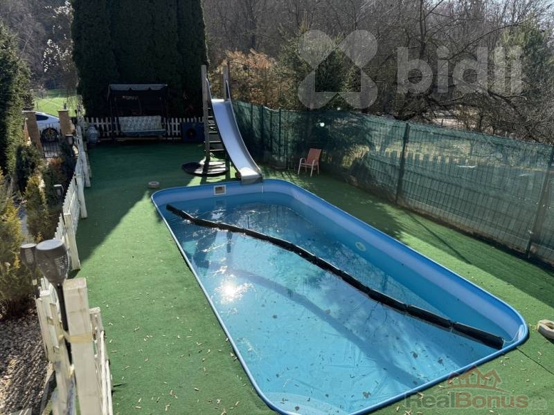 Celý pozemek o rozloze 387 m² je chytře rozdělen tak, aby vzrostlá zeleň v přední části zajišťovala klid a odclonění od okolí, zatímco zahrada je plně vybavena pro rodinný relax i zábavu díky bazénu s tepelným čerpadlem a skluzavkou, trampolíně, kotci pro psa i praktickému zázemí.