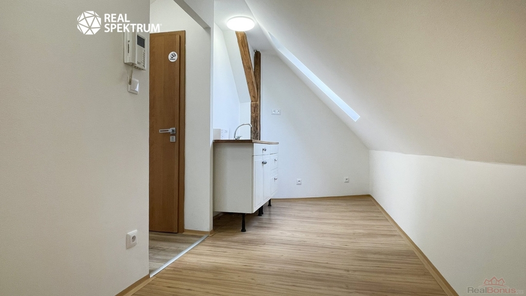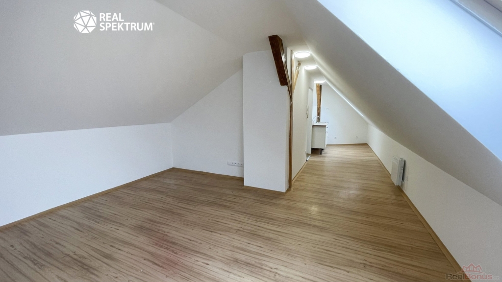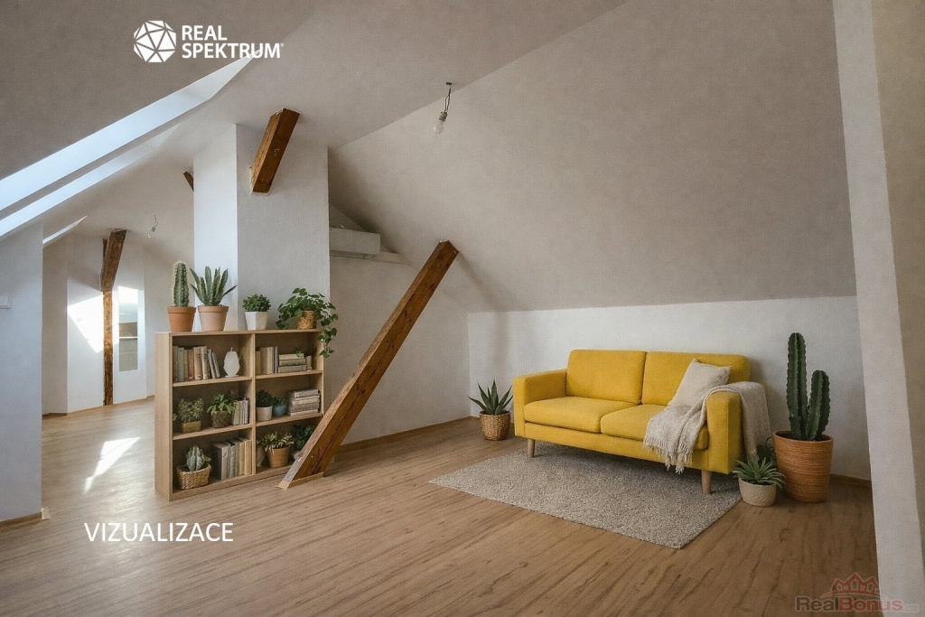 Byt vznikl přestavbou půdy, což potvrzují přiznané dřevěné trámy, které podtrhují stylově propojený prostor po celé délce. Díky střešním oknům je interiér dostatečně prosvětlený a podkrovní dispozice vytváří útulnou atmosféru. Proto je tato půdní vestavba ideální jako pohodlné hnízdečko pro jednotlivce nebo pár, kteří mají rádi originální prostor vybízející ke kreativitě v zařizování. Byt je v horním patře umístěn jako jediný, což znamená absenci zvuků od sousedů. Majitelce nevadí menší domácí mazlíček.