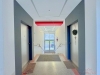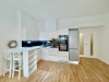 Předsíň je vybavena vestavěnými skříněmi s prosklením zrcadly. Obývací pokoj je rozlehlý a má kuchyňský kout se vestavěnými spotřebiči. Je zde stůl se dvěma vysokými židlemi a skříňka s televizí.