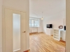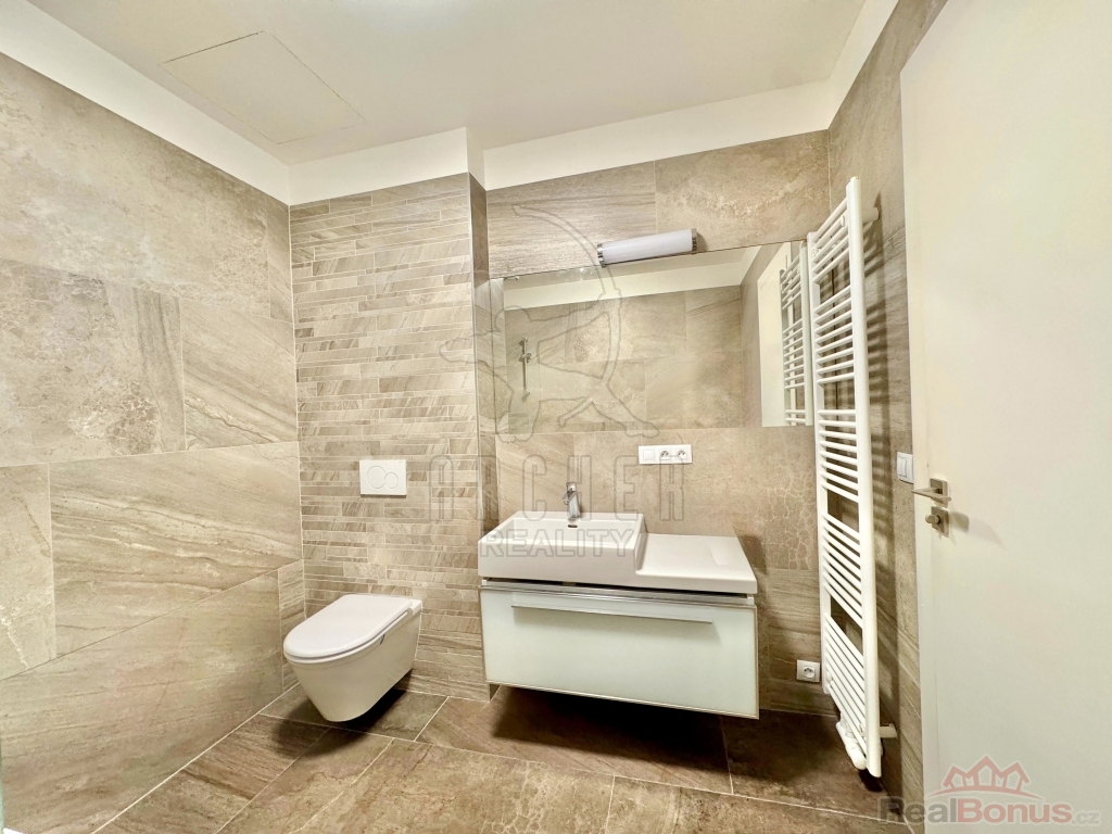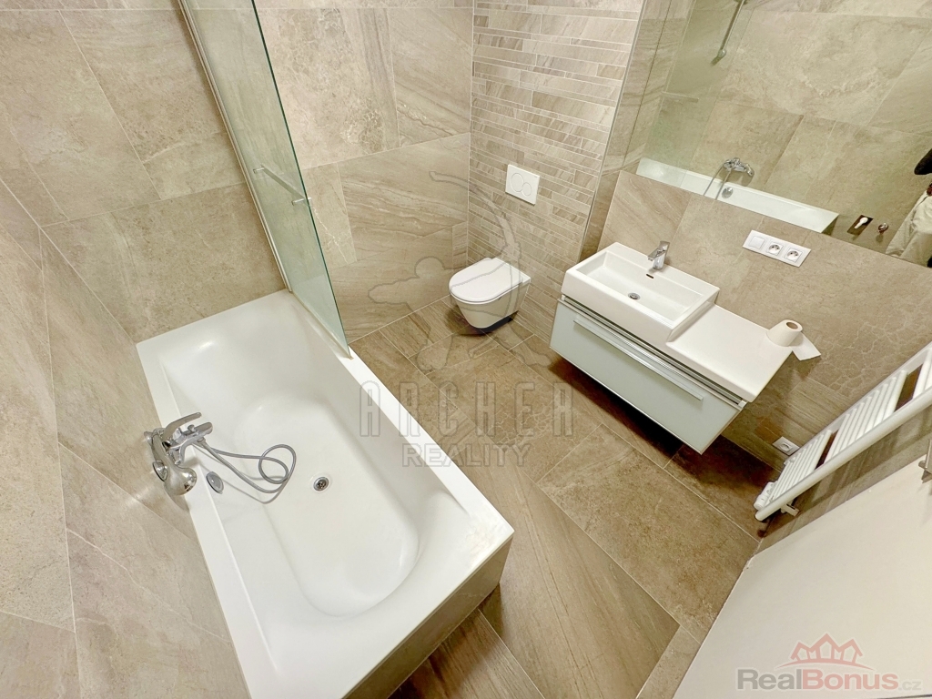 Dveře bytu jsou moderní bezfalcové s designovými klikami. Podlahy mají povrch z masivního dubu. V koupelně jsou velkoformátové dlaždice z umělého mramoru.