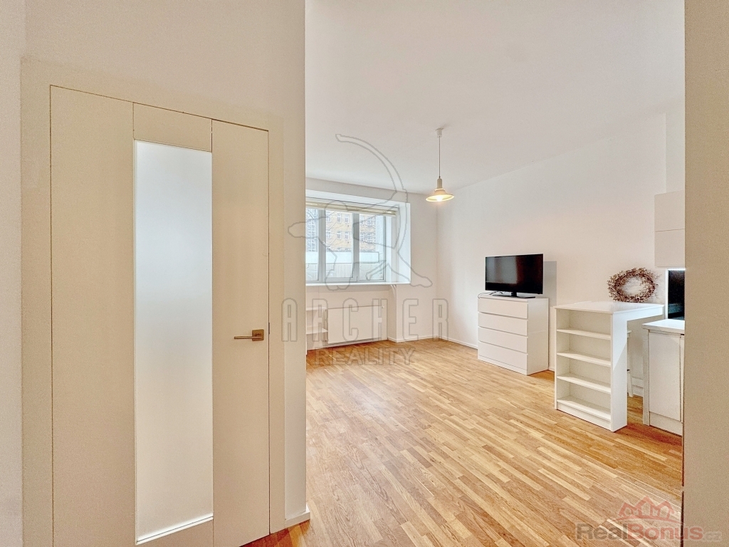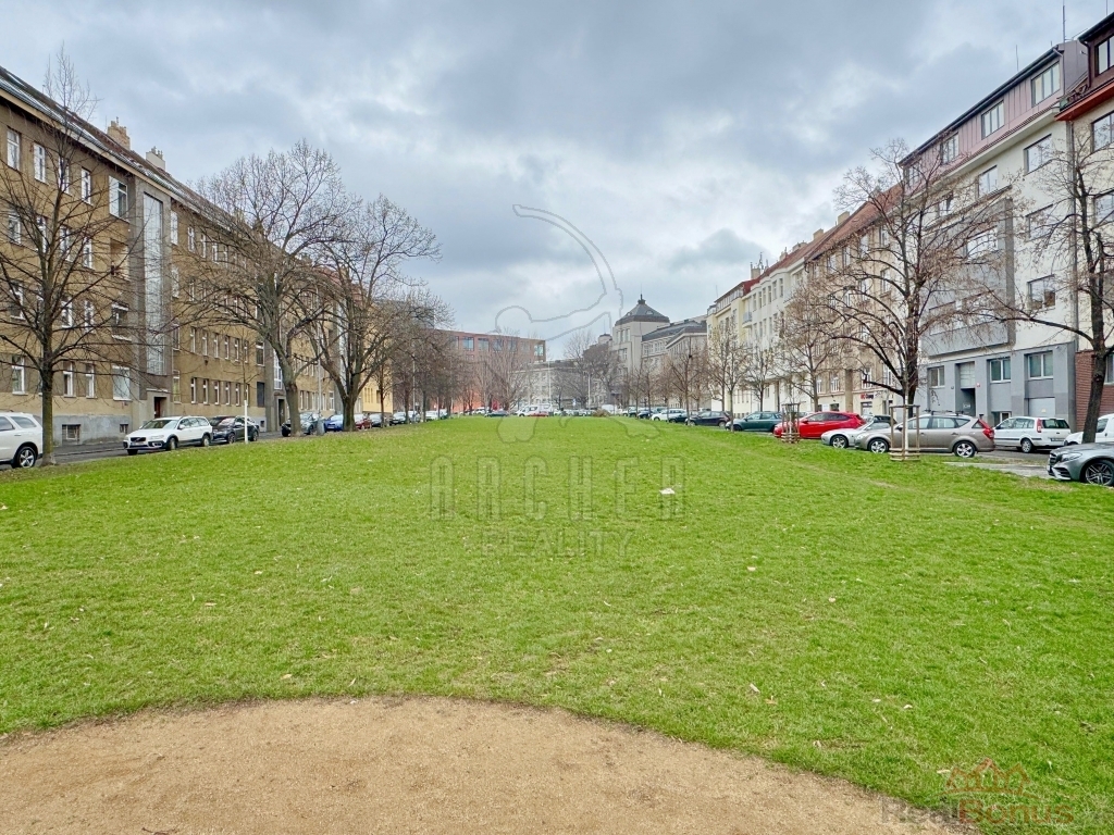 Okna vedou do ulice obklopující Engelův zelený pás, vedoucí zástavbou, který propojuje zelení části Prahy 6 se Stromovkou. Byt je umístěný ve zvýšeném suterénu a je přístupný jak po schodech, tak i výtahem. K bytu patří sklepní kóje 3m2.