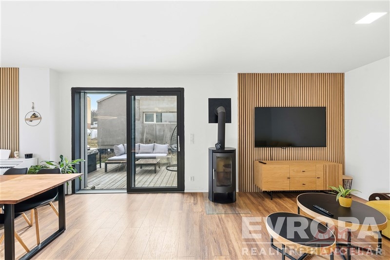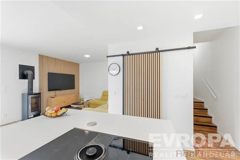 Dominantou rodinného domu je obývací pokoj s kuchyní. Vstup na terasu umožňuje HS portálové okno. Dalším prostorem k využití je i mezonetové patro nad ložnicí. Momentálně využívané jako dětská hernička. Nicméně prostor může sloužit i jako odpočinkový prostor pro čtení, relaxaci či meditaci. Necháme už na vaší fantazii.