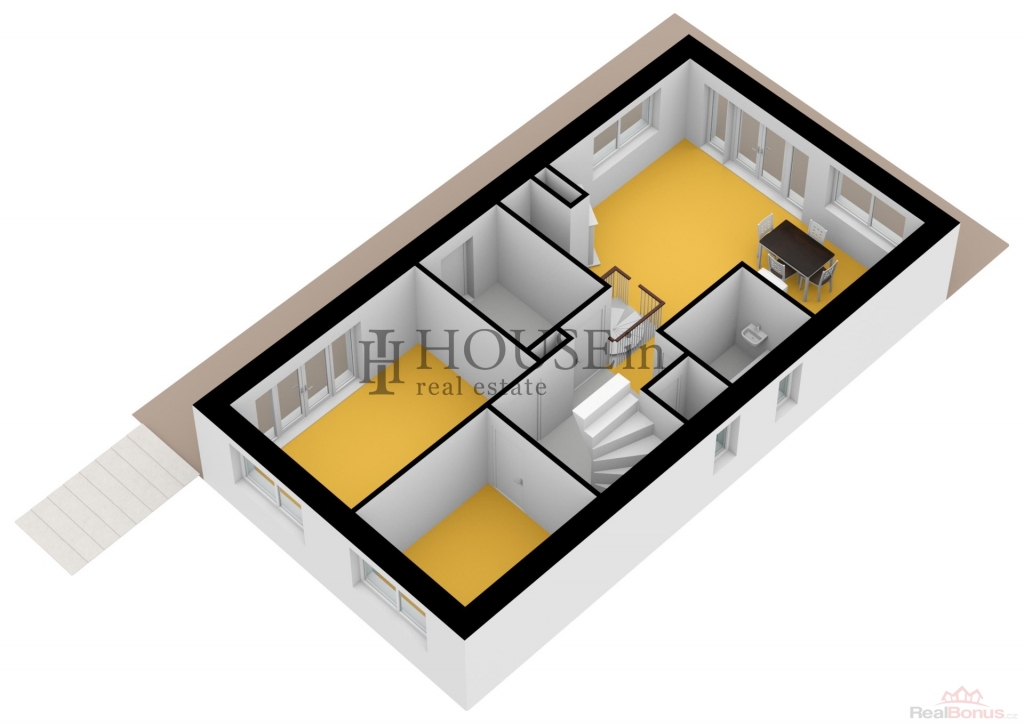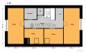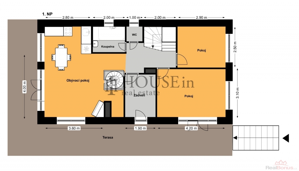 1. NP: zádveří, chodba, obývací pokoj s kuchyňským koutem a vstupem na terasu, kuchyň, dětský pokoj, ložnice, koupelna s vanou, samostatná toaleta