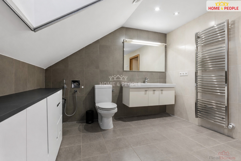 V přízemí domu vstoupíte do prostorné haly, kde se nachází prostorná technická místnost, koupelna s WC, velký obývací pokoj s krbem se vstupem na zahradu, moderní kuchyň s prostornou jídelnou a praktický sklad, pokoj pro hosty. Dřevěné schodiště Vás dovede do prvního patra, kde je umístěna ložnice se šatnou s vestavnými skříněmi pro uložení všech věcí a samostatnou koupelnou. Dále najdeme další 3 pokoje, kde v jednom z nich se opět nachází šatna, na chodbě je koupelna s WC a komora, vstup na půdu, která též pojme spoustu sezónních věcí.