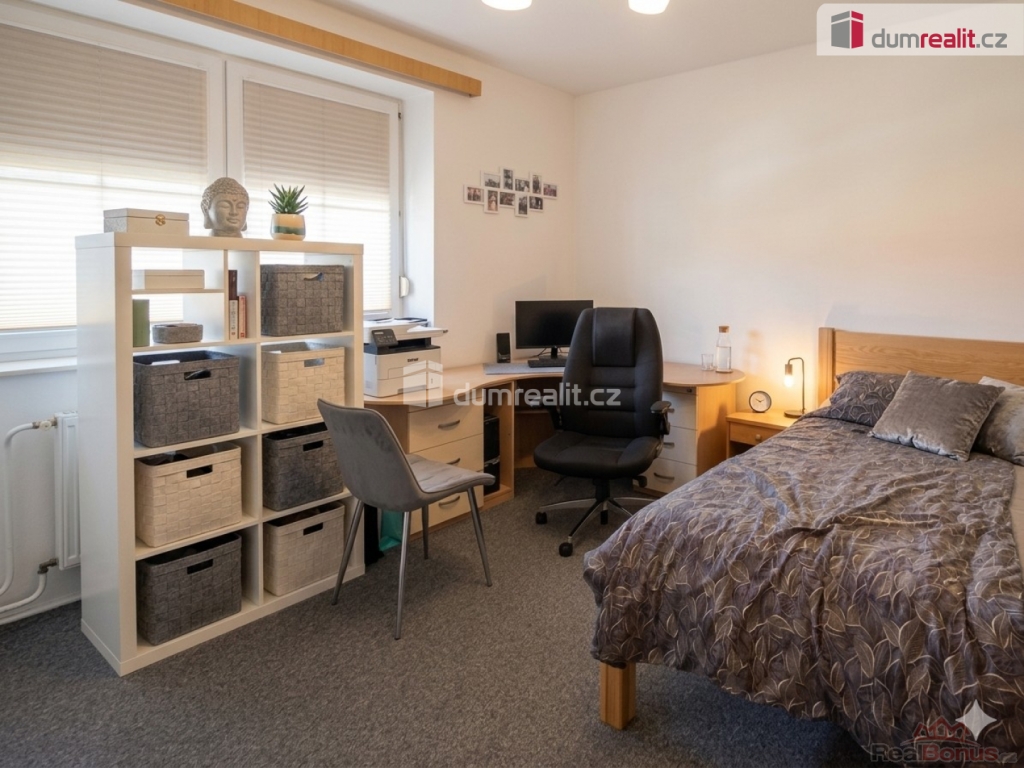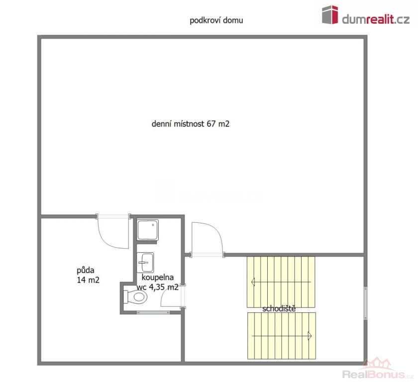 Podkroví: Horní část tvoří příjemná denní místnost prosvětlená střešními okny a druhá koupelna s toaletou. Celý byt je přístupný po vnitřním schodišti.
