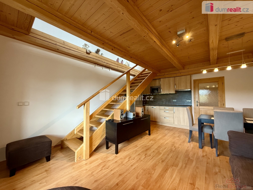 Vratná kauce 2 x měsíční nájem. Provize RK 1 x měsíční nájem. Včetně právního servisu., Pronájem exkluzivního podkrovního mezonetového bytu 3+kk o rozloze 74 m, který se nachází v atraktivní a žádané lokalitě Vítkovice v Krkonoších. Tento moderní byt nabízí komfortní bydlení v originálním prostoru s důrazem na kvalitu a design, ideální nejen pro milovníky hor a outdoorových aktivit.