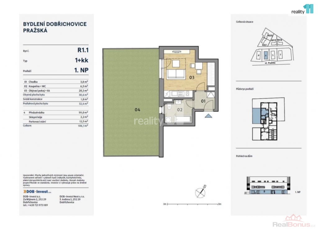 Nezařízený byt, s výměrou 32.4 m, je dispozičně rozdělen na vstupní chodbu, ze které se vchází do obytného pokoje, kde bude nová kuchyňská linka na míru (bude zde varná deska, trouba, myčka), s francouzským oknem a vstupem na předzahrádku (59 m, bude zatravněná). Koupelna s vanou a toaletou. V celém bytě použity kvalitní, moderní materiály v neutrálních barvách - dřevěné podlahy, rekuperace, podlahové topení v koupelně, venkovní rolety. Velkou výhodou bytu je úložný prostor - zděný sklep a vlastní parkovací stání. V domě je také kolárna.