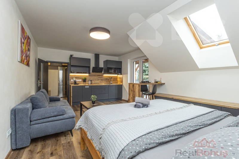 Dovolujeme si vám nabídnout dva apartmány: 1+kk: Nabízíme k prodeji moderní apartmánový byt situovaný v 2NP revitalizovaného bytového domu s výtahem, který se nachází v malebném podhorském městě Vrbno pod Pradědem. Dům je energeticky nenáročný a poskytuje svým obyvatelům komfortní a úsporné bydlení v těsné blízkosti přírody. Apartmán je orientovaný na západ, díky čemuž nabízí krásné výhledy na okolní přírodu a dokonalé večerní atmosféry na prostorné z části kryté střechou terase. Interiér je nadčasově a velmi kvalitně vybaven, a to včetně moderního systému podlahového vytápění s možností dálkového ovládání. Stejně tak je i vstup do apartmánu řešen chytrým kódovým zámkem, ideálním v případě využití nemovitosti k rekreačním pronájmům. Stejně tak i k trvalému bydlení.
