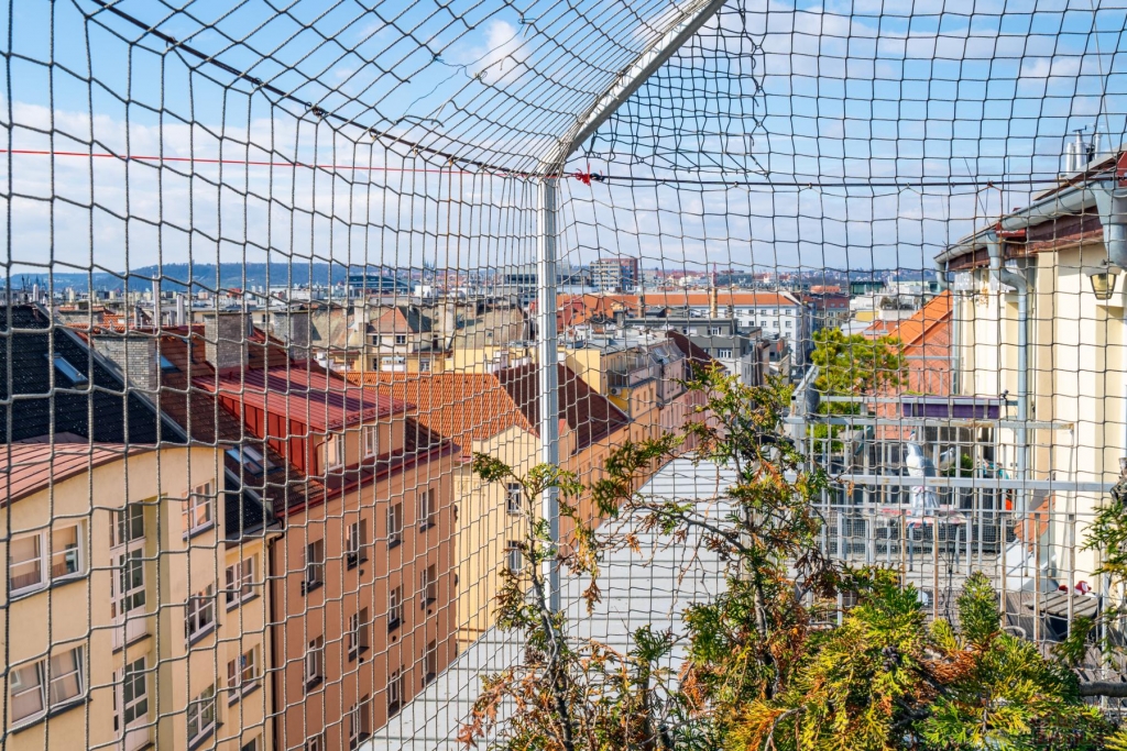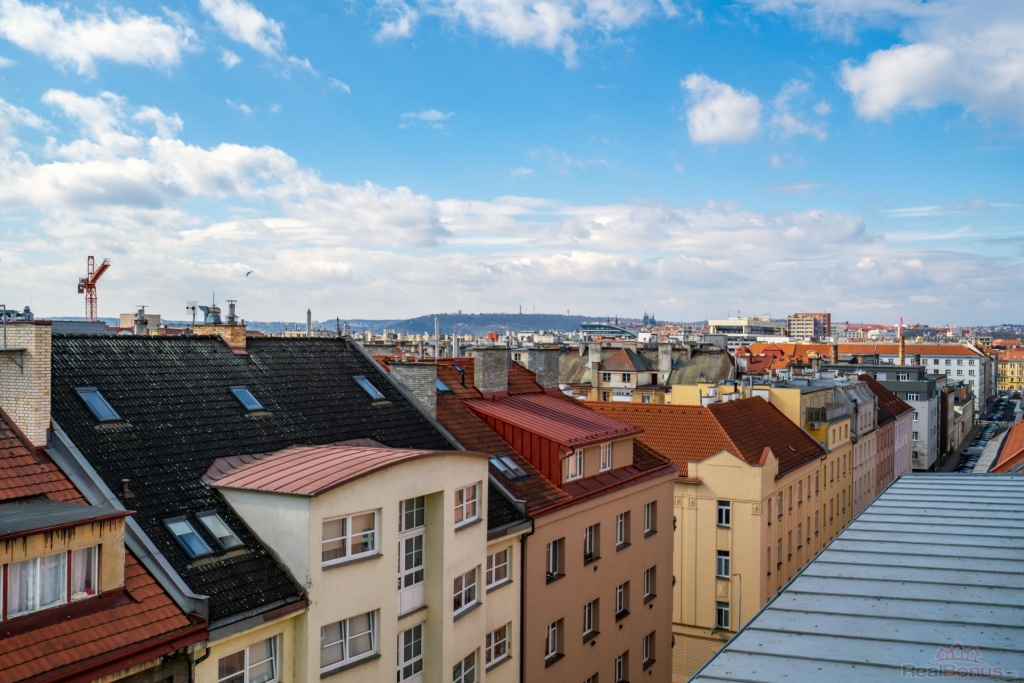 Velkou výhodou je umístění v posledním patře, díky kterému byt nabízí dostatek světla, soukromí a především krásný výhled na Prahu.
