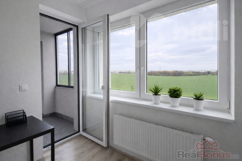 Byt nabízí příjemný výhled do zeleně, který zajišťuje klid a soukromí.