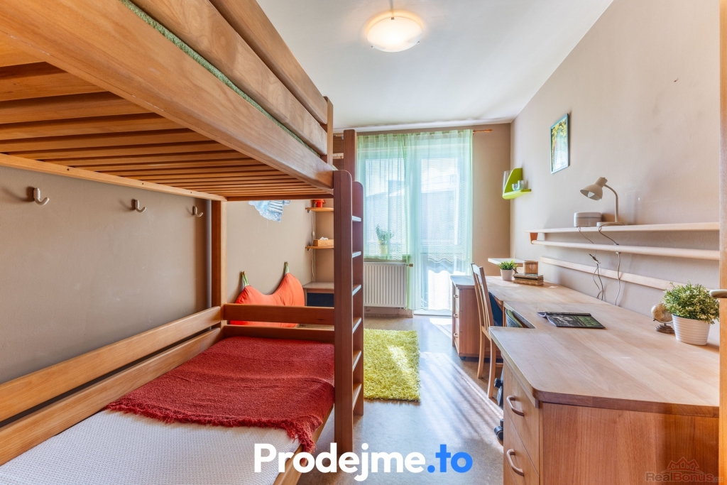 Byt se nachází ve třetím podlaží čtyřpodlažního cihlového domu. Dispozice 3+1 o podlahové ploše 79,2 m2 je prakticky řešená pro každodenní život. Tvoří ji prostorná předsíň, ložnice, kuchyně a obývací pokoj, přes který se vstupuje do dětského pokoje. Z něj je přístup na balkon o velikosti 3,4 m2 vybavený markýzou. Okna ložnice a dětského pokoje směřují do klidného zeleného vnitrobloku, takže vás při odpočinku nebude nic rušit. Všechna okna v bytě jsou navíc doplněna sítěmi proti hmyzu.