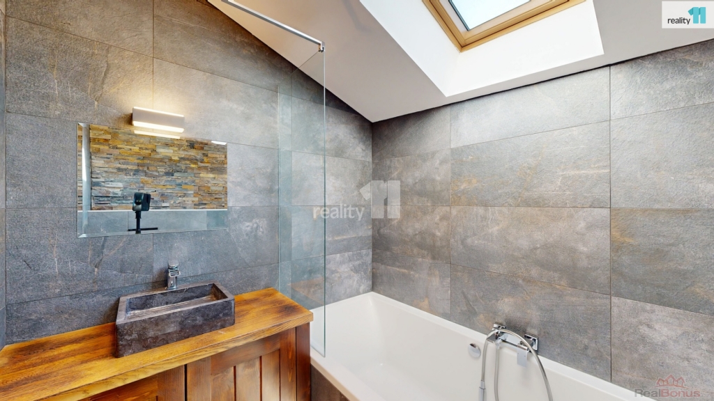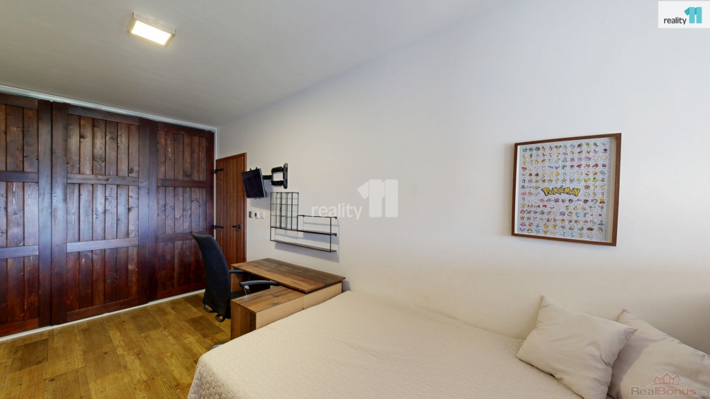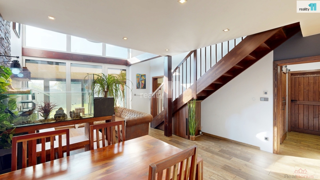 Dvě ložnice a hlavní koupelna s vanou, nás čekají v patře, kam se dostaneme po dřevěných schodech. Pokud by nový majitel pořebova potřeboval, dá se přistavět ještě pokoj nad střechu garáže, při jejíž výstavbě se s touto variantou počítalo. Dům je plný světla, i díky jedné stěně, která je kompletně prosklená. Jsou zde kvalitní podlahy, obklady i sanitární technika, podlahové elektrické vytápění, klimatizační jednotky. Majitelé nad zařízením důsledně přemýšleli, aby v domě byl dostatek úložných prostor a dál působil vzdušně a pohodlně, takže jsou využity i prostory pod schodištěm a další zákoutí. Zimní zahrada se vstupem na terasu, má přípravu i pro případné umístění krbových kamen. Terasa slouží zejména pro relaxaci, grilování, posezení a rozděluje zahradu na přední a zadní část. Přední část je travnatá s automatickou závlahou, s několika okrasnými keři a slouží zejména pro děti. Zadní část je vydlážděná, vhodná pro parkování aut. Je zde také menší technický domek, i když v garáži je opravdu dostatek prostoru i pro vášnivého kutila.