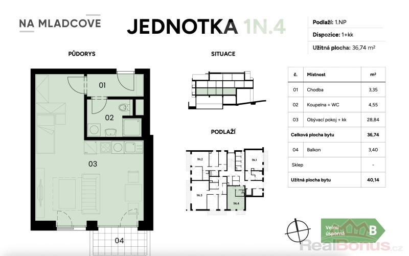 V exkluzivním zastoupení Vám nabízíme ke koupi byt o dispozici 1+kk (36,74 m2) s balkonem (3,40 m2) v 1.NP komorního developerského projektu "Byty na Mladcové".