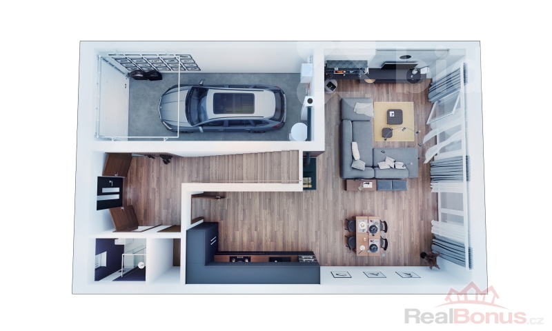 V přízemí se nachází garáž a hlavní obytná zóna - srdce domu - tedy kuchyňský kout propojený s velkorysým obývacím prostorem o výměře 42 m2. V patře následně klidová část, tedy 3 pokoje, koupelna se sprchovým koutem i vanou a dostatek úložného prostoru. Velká okna přinášejí do interiéru příjemné světlo a umožňují přímý vstup na soukromou zahradu o rozloze 363 m2. Ta je jako stvořená pro víkendová grilování, dětské hry nebo klidné večery pod širým nebem.