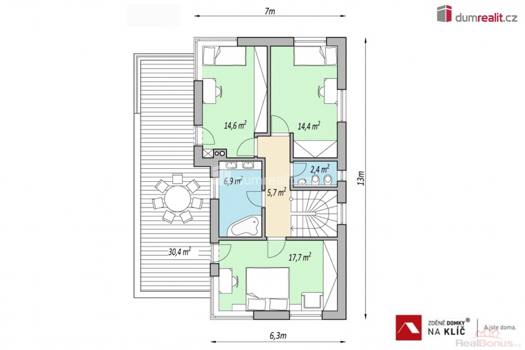 Cena včetně pozemku, výstavby RD, IS, příjezdové komunikace a DPH., Dumrealit.cz Vám zprostředkuje exkluzivní prodej patrového rodinného domu typu Lotus o velikosti 5+kk o podlahové výměře 149 m v Uherském Brodě části Těšov. Rodinný dům Lotus je typ rodinného domu vhodný do rovinatého, ale i mírně svažitého terénu. Součásti uvedené ceny, která již zahrnuje DPH je dům na klíč, inženýrské sítě v dosahu a připojené místo EDG (EON), mimo plynu, pozemek a veškeré projektové práce i stavebního povolení. Pozemek (E) o výměře 1331 m je na klidném místě obce. Šíře pozemku je 21,5 m. Navíc k nabízenému pozemku je i podíl na dalším pozemku za zahradou. Dle územního plánu je pozemek veden a schválen pro rodinné bydlení. Jedná se o zděnou stavbu a nabízí se ve variantě na klíč. Uvedená cena domu obsahuje základovou desku, DPH a stavba bude provedena na klíč a předána po kolaudaci k okamžitému užívání. V projektu jsou možné variabilní úpravy dispozice (posuny příček či oken).