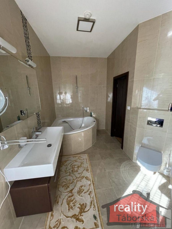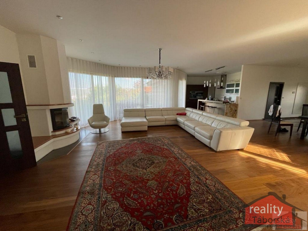 Obývací pokoj se stylovým krbem a jídelním koutem (57,88m2), kuchyňský kout s luxusní kuch. linkou s kvalitními spotřebiči značky MIELE (16 m2), tři pokoje (14,60m2, 15,18m2, 15,88m2) a ložnice (22,19m2), jsou vybaveny klimatizací. Dále je v domě prádelna (7m2) s pračkou a sušičkou.3x šatna, 2x koupelna.