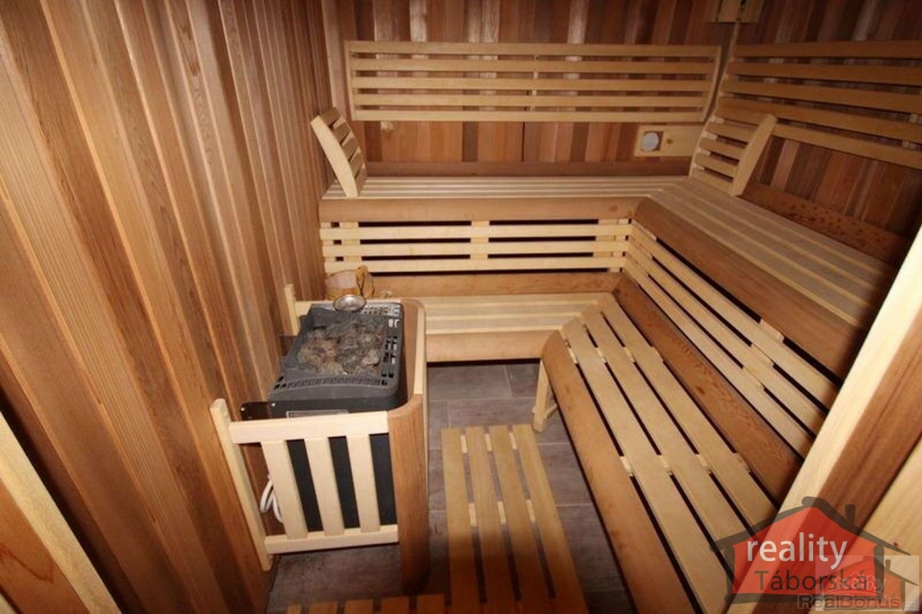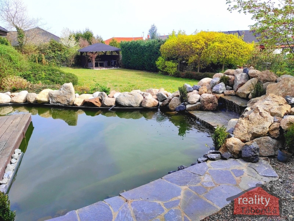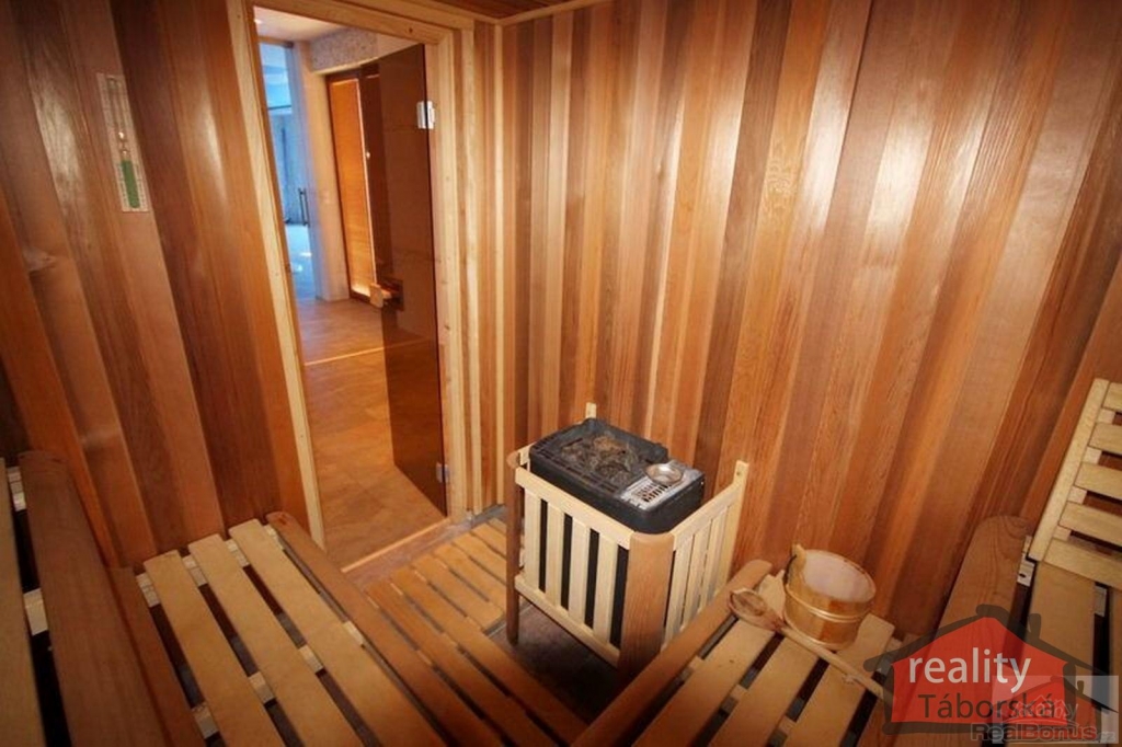 Součástí domu je také terasa ze severské borovice nad přírodním jezírkem s tekoucí vodou a s KOI kapry, bazénový prostor s vnitřním bazénem (56,48m2) a finská sauna (5,06m2).