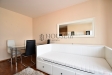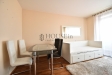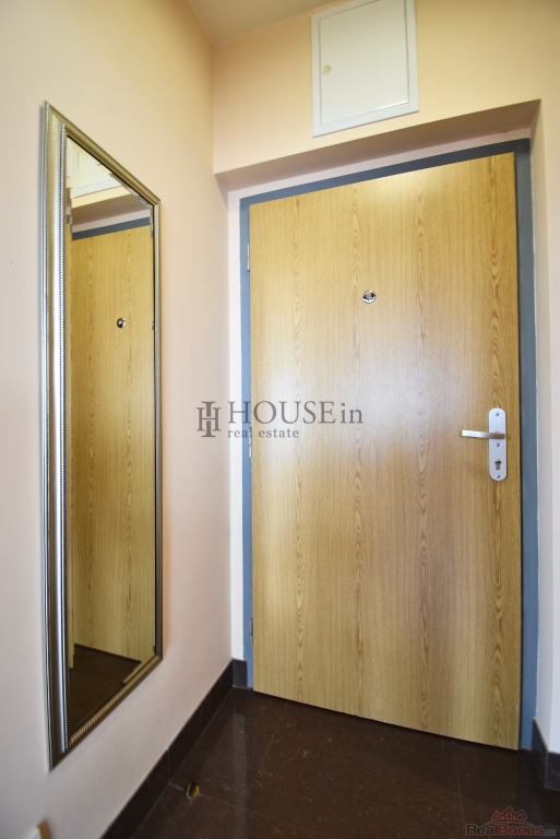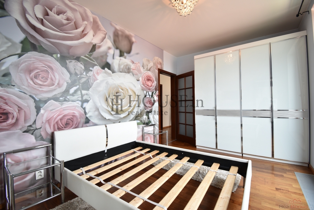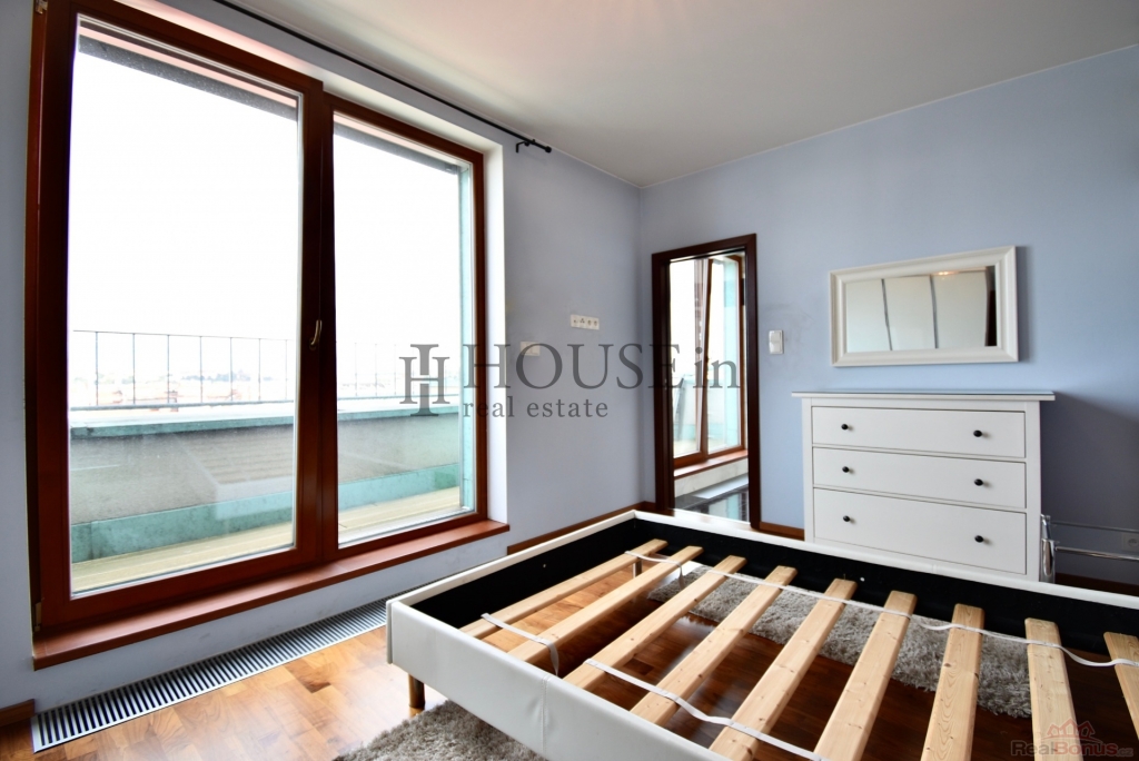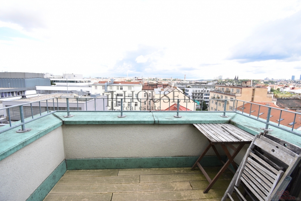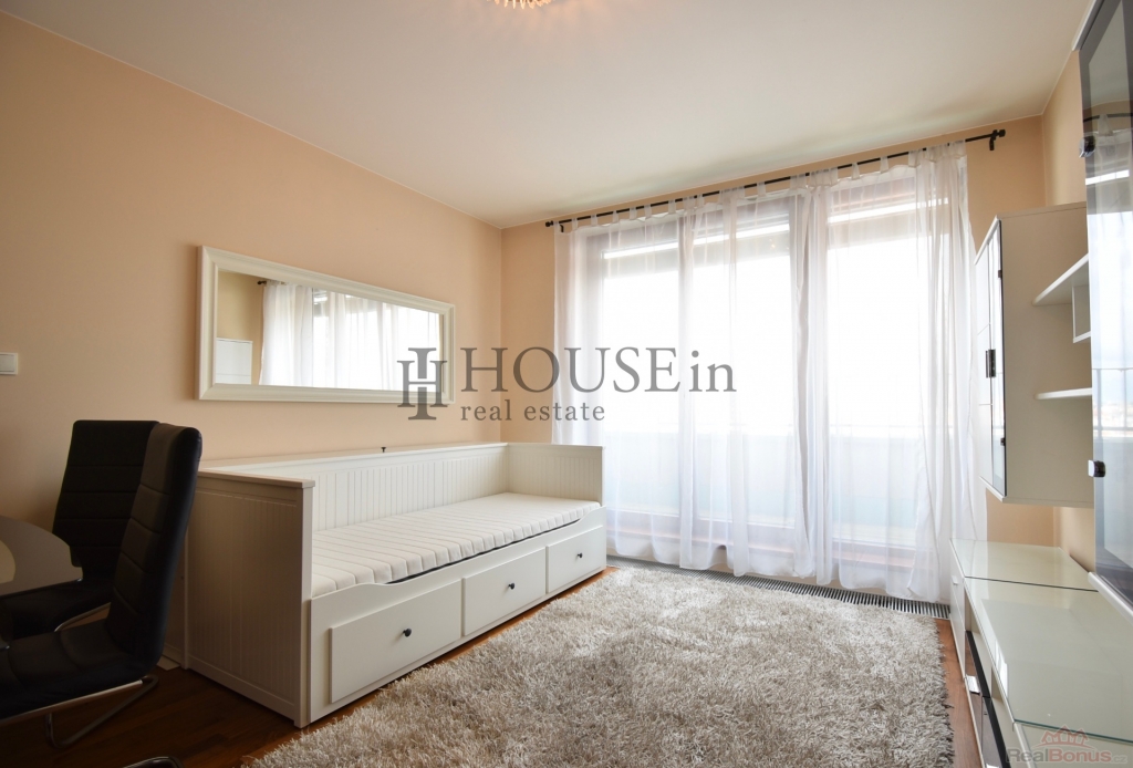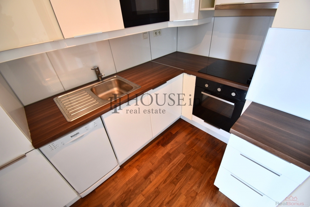 Byt nabízí prakticky řešenou vstupní předsíň s úložným prostorem, komoru, prostorný obývací pokoj se sedací soupravou, jídelním stolem se židlemi a obývací stěnou. Kuchyňský kout je oddělený a plně vybavený spotřebiči, mezi které patří myčka, sklokeramická varná deska, elektrická trouba, digestoř a lednice s mrazákem. Ložnice je zařízena velkou šatní skříní a dvoulůžkovou postelí bez matrace. Z obývací části je přímý vstup na slunnou terasu s krásným výhledem na Vyšehrad a panorama Prahy. Pozn.: byt se pronajímá bez pračky, která je na fotografii v inzerci.