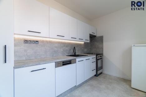 Dispozice zahrnuje dva pokoje a kuchyň vybavenou všemi spotřebiči, včetně myčky na nádobí. Na prostornou chodbu navazuje samostatná toaleta a koupelna s velkým sprchovým koutem a místem pro pračku.