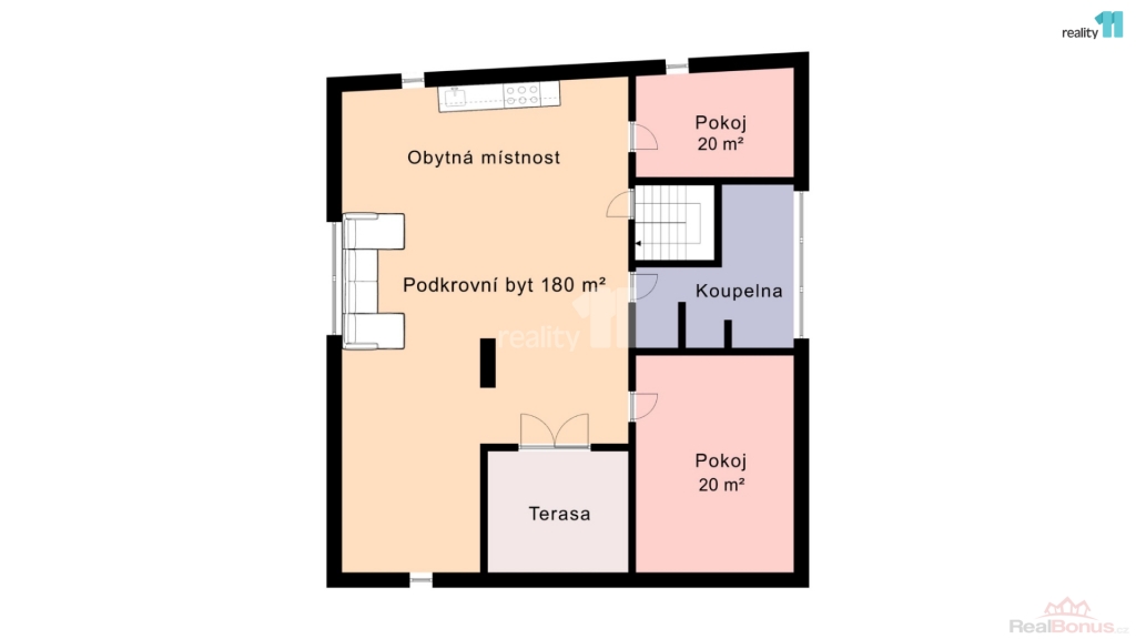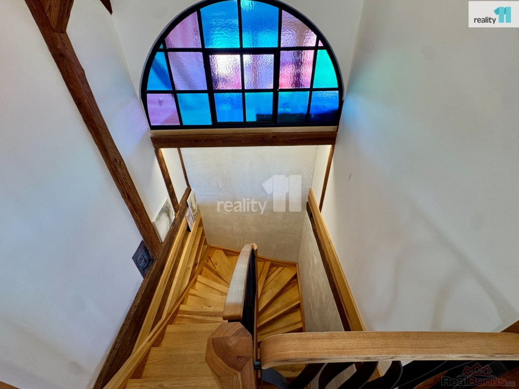 V horním patře je podkrovní byt 3+kk o ploše 180 m s terasou a výhledem na tvrz. Vhodný pro vlastní bydlení, dlouhodobý pronájem i rozšíření ubytování.