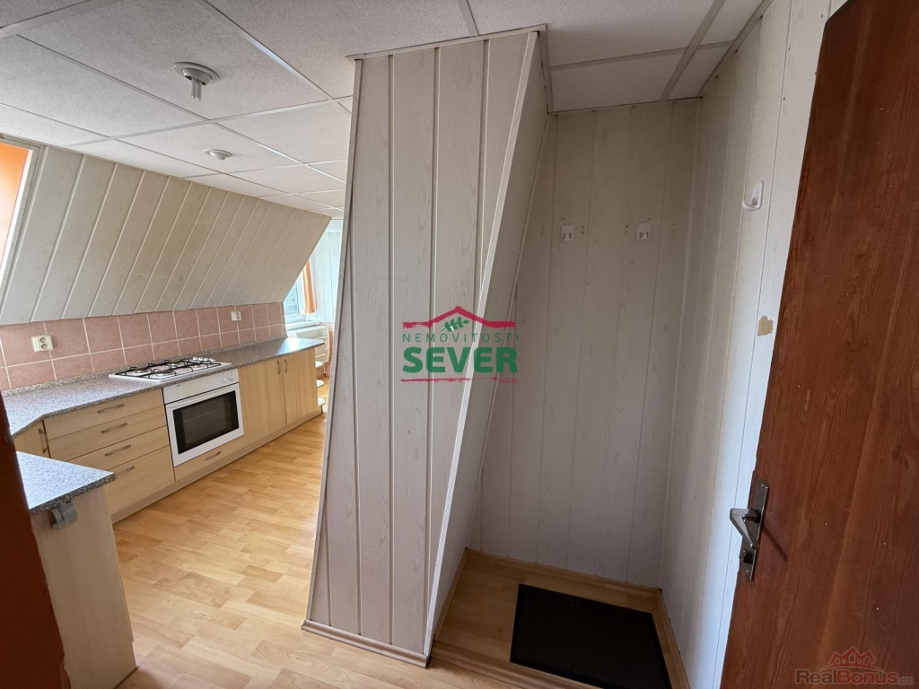Nemovitosti SEVER vám zprostředkují prodej bytu 2+kk v osobním podílovém spoluvlastnictví, Horní Litvínov, okr. Most, Komenského. Bytová jednotka po částečné rekonstrukci, o výměře 48 m2, se nachází ve třetím nadzemním podlaží cihlového domu a jeho součástí je velký sklep, půda a pozemek za domem, který se používá jako zahrada k relaxaci. Půdní prostor lze dokoupit k vytvoření další místnosti. V podkrovním bytě je kuchyně propojena s obývacím pokojem. Je zde nová rohová kuchyňská linka obložena dlaždičkami, kombinovaný sporák, na zemi plovoucí podlaha. V ložnici je krytina PVC a zadní místnost jde používat jako šatna. Jsou zde nová okna Velux, dřevěné dveře se zárubněmi, rozvody vody v plastu a topení v mědi. Koupelna a WC jsou společné ve zděném jádru, v částečném keramickém obkladu. Je zde sprchový kout, přípojka na pračku, odvětrávací okno a plynová karma na ohřev vody. Vytápění bytu je řešeno plynovými gamaty. Byt je možné zakoupit i s nájemníkem na investici. Dům se nachází v klidné části města bez problémových nájemníků v blízkosti centra města.