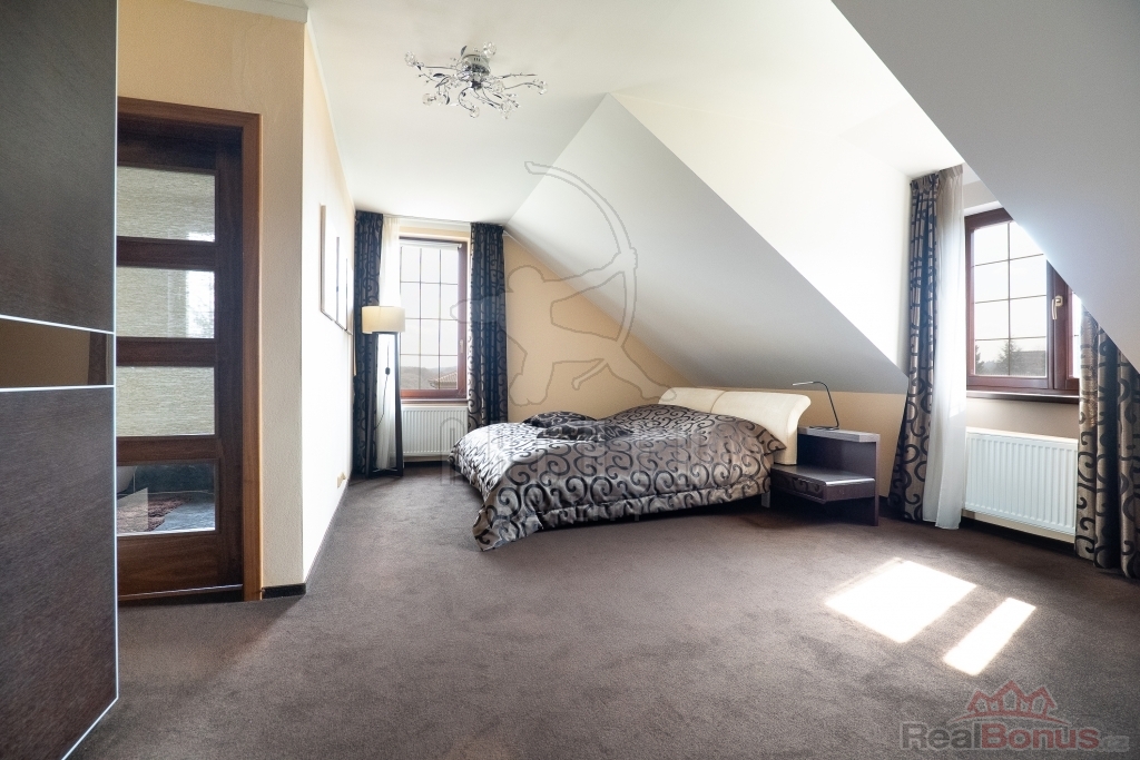 Patro domu je propojeno schodištěm s masivními nášlapy a nabízí prostornou galerii, čtyři neprůchozí pokoje a komfortní rodinné zázemí - velkou koupelnu s rohovou vanou a toaletou a bonus vlastní koupelny jako součást hlavní ložnice.