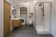 Zděná koupelna společně s hlavním WC, umývadlem se zrcadlem, sprchovým koutem a plynovým kotlem má samostatný vstup z předsíně a utváří jedinou místnost opatřenou keramickými obklady a keramickou dlažbou. Podlahy v bytě tvoří betonový potěr krytý keramickou dlažbou v předsíni, koupelně a komoře. V jedné místnosti s kuchyní tvoří podlahu původní zachovalé fošny kryté PVC, v dalších obytných místnostech tvoří podlahy parkety kryté PVC a kobercem. Tepelný komfort zajišťuje plynový kotel s rozvody vody do radiátorů, využívaný také pro ohřev teplé vody. Rozvody TV signálu ze společné antény. Okna bytu jsou situována na dvě světové strany (východ - západ).