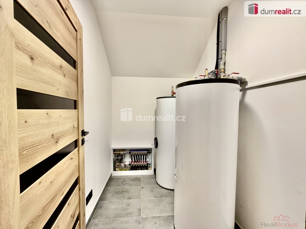 O tepelný komfort a nízké provozní náklady se stará podlahové vytápění napojené na tepelné čerpadlo, okna s trojskly zajišťují výbornou tepelnou i akustickou izolaci. V obytných místnostech jsou položeny kvalitní vinylové podlahy, v zádveří a koupelnách praktická dlažba. Interiér laminátové dveře a zárubně v dřevěném dekoru s černým kováním a moderní zásuvky a vypínače. Velkým benefitem je také instalovaný nerezový komín, který umožňuje bezproblémovou instalaci krbu nebo krbových kamen.