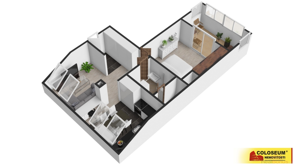 Dispozice bytu je velmi praktická ? obývací část je propojena s kuchyňským koutem, což vytváří vzdušný a příjemný prostor pro každodenní život. Kuchyňská linka je stará pouhé 4 roky a nabízí dostatek pracovního i úložného prostoru, samozřejmostí jsou spotřebiče i místo pro jídelní stůl.