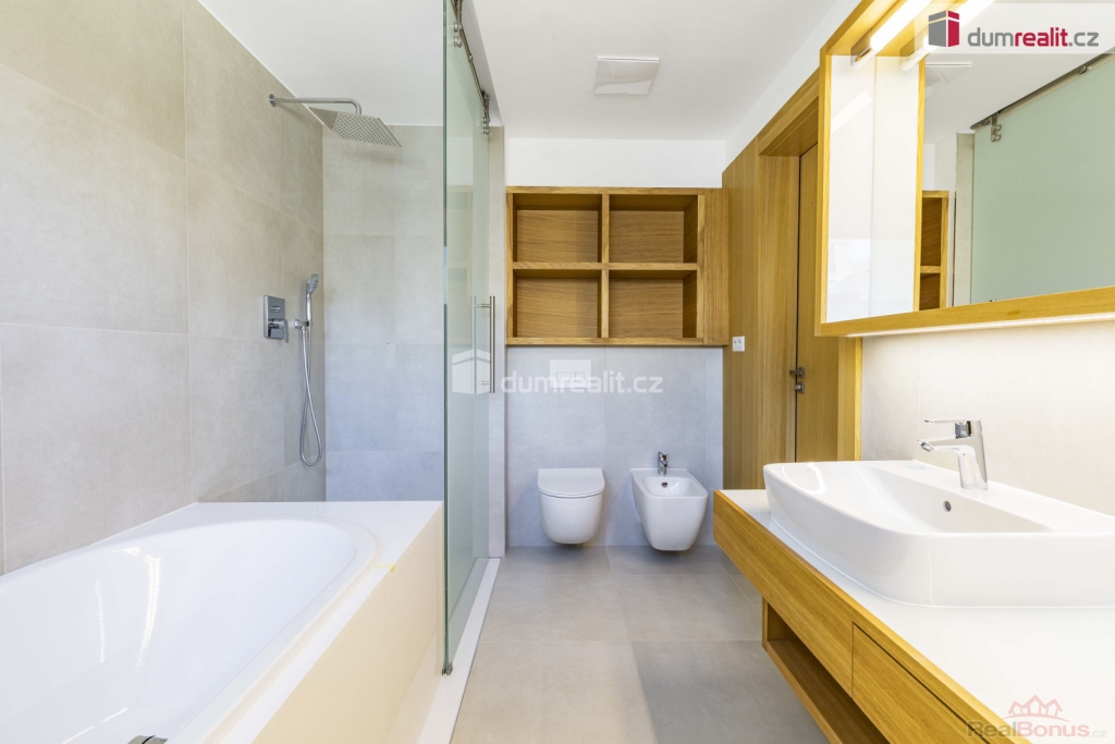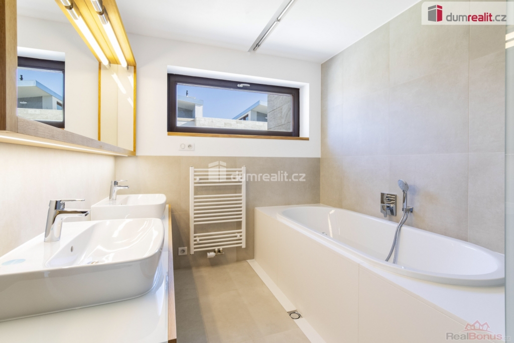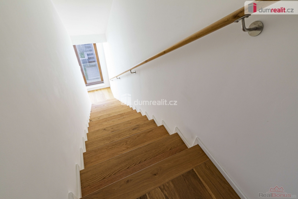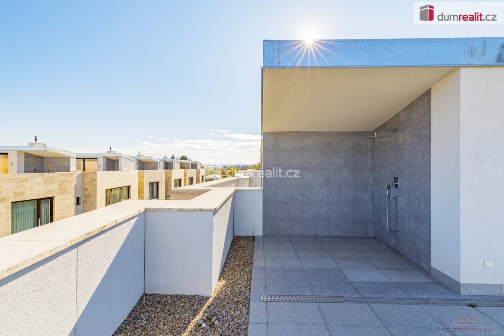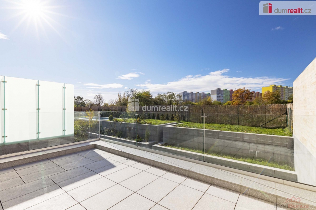 cena je vč. odměny RK, Hledáte nadstandartní dům v blízkosti budoucí stanice metra? Tak právě pro vás zde mám multifunkční, vícegenerační rodinný dům s dispozicí 6+kk v Praze 12 Libuš, který je vzdálen pouze 2 minuty pěšky od budoucí stanice metra D - Libuš a je v uzavřeném rezidenčním areálu s dalšími 15 domy. Celková podlahová plocha domu je 285,3 m, jsou zde dvě terasy (73,9 m), plocha pozemku je 261 m z toho zahrada má celkem 128 m. Dispozice tohoto moderního, nízkoenergetického domu tvoří v přízemí: prostorný obývací pokoj + kk (63,2 m) se vstupem na terasu (20,1 m), pracovna (15 m) s vlastní koupelnou s WC (4,2 m) a zádveří (7,5 m). Po schodišti (6,6 m) obloženém dřevem se dostaneme do 1. patra (2NP), kde je hlavní ložnice (21 m) s šatnou a vlastní koupelnou s WC (8,5 m), dále centrální koupelna (6,6 m) s WC a bidetem, hala (5,8 m) a dva dětské pokoje (18,6 + 19,5 m). Po dalším schodišti se dostaneme do menší chodby (6,3 m), která velkoformátovým oknem s HS portálem navazuje na panoramatickou terasu 74,4 m, která je z části krytá (prostor na vířivku) a je orientována na východ, sever a západ. Z obývacího pokoje se po schodišti dostaneme do suterénu domu, kde je multifunkční místnost, kterou můžete zcela upravit podle svých potřeb. Tato místnost má nadstandartních 62,4 m a můžete zde mít opravdu cokoliv např. samostatnou bytovou jednotku 1+kk s koupelnou a WC, kinomístnost, karaoke, panský klub, fitness anebo svoji soukromou pracovnu (např. pro advokáty, architekty, projektanty, daňové poradce apod.). Tato místnost je nedokončená a je připravena na úpravy dle vašich představ. Místnost má také přístup přímo z garáží velmi výhodné. V suterénu domu je dále chodba se zádveřím a sklep / tech. místnost (12,3 m) a komora (5 m), kde je umístěný plynový kondenzační kotel. Ze suterénu je také vstup na zahradu (98 m), která je kaskádovitá. Další zahrada je před vstupem do domu (30 m) ve vnitrobloku. V celém domě je podlahové topení, okna jsou dřevěná, v obývacím pokoji a na terase je HS portál, u všech oken je příprava na před okenní žaluzie, v domě je zavedeno optické vlákno na internet, podlahy jsou dřevěné vč. obložení schodiště. Vstupní dveře do domu jsou bezpečnostní, interiérové pak také dřevěné s obložkami. V areálu tohoto projektu je klid a soukromí. Osobně mohu doporučit, můj velmi blízký přítel zde bydlí, rád vám jako zájemci o koupi může předat další informace. Tento dům je rohový a celý projekt je umístěn na konci slepé ulice se vstupem do budoucího parku. Stanice metra D - Libuš bude v docházkové vzdálenosti - realizace 2032. Velmi vám doporučuji prohlídku tohoto domu 6+kk (285,3 m), který vás svou velikostí ohromí, dispozicí nadchne, a nakonec chytí za srdce. Kompletní webová prezentace tohoto domu s více fotkami, plánky a informacemi je na našich webových stránkách Ev. číslo: 655256. Energetický štítek: B (81 kWh/m2/rok).