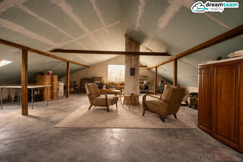 Nový kotel Blaze Harmony na dřevo je investice, na které majitelka nešetřila. A zateplené podkroví s přiznanými trámy a přivedenou elektřinou? Impozantní prázdný prostor, který jen čeká, jestli si z něj uděláte herní centrum, pracovnu nebo třetí bytovou jednotku. Meze se nekladou.