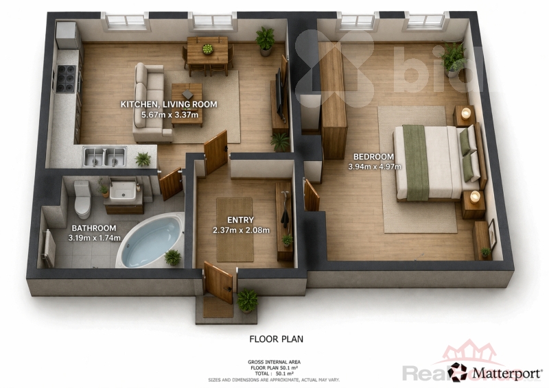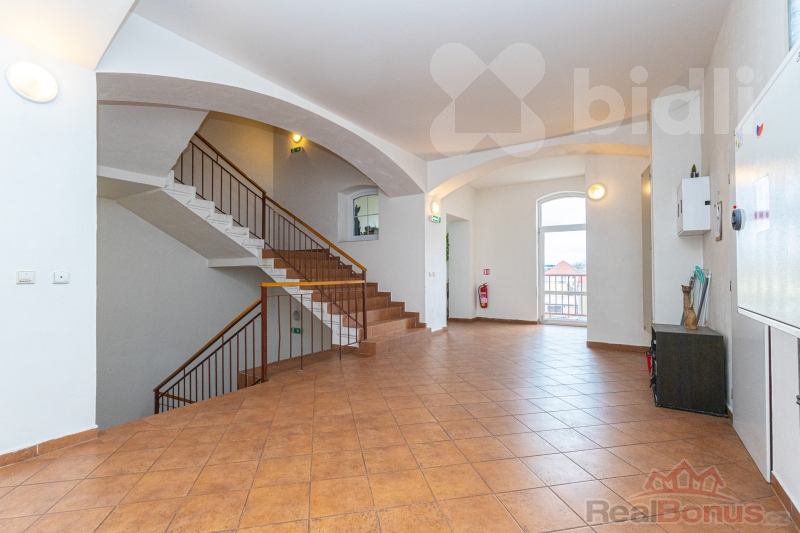 Dispozici tvoří vstupní chodba, předsíň, obývací pokoj s kuchyňskou částí, prostorná ložnice a koupelna s rohovou vanou a toaletou. K bytu náleží sklep a také parkovací stání ve dvoře, do kterého je vjezd zajištěn automatickou bránou.