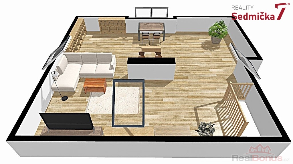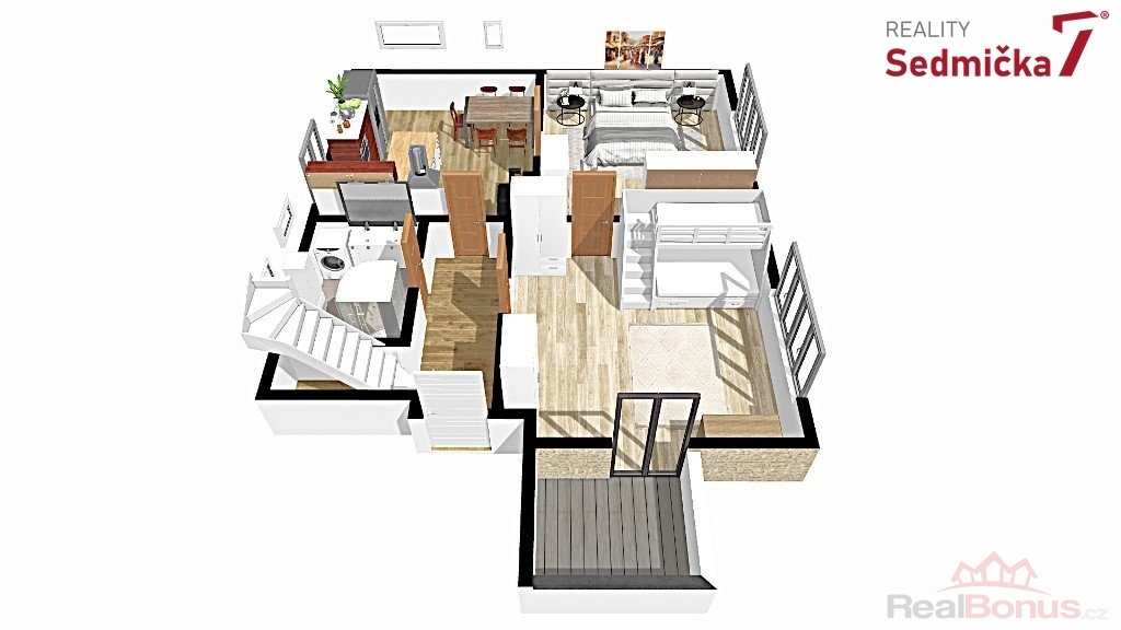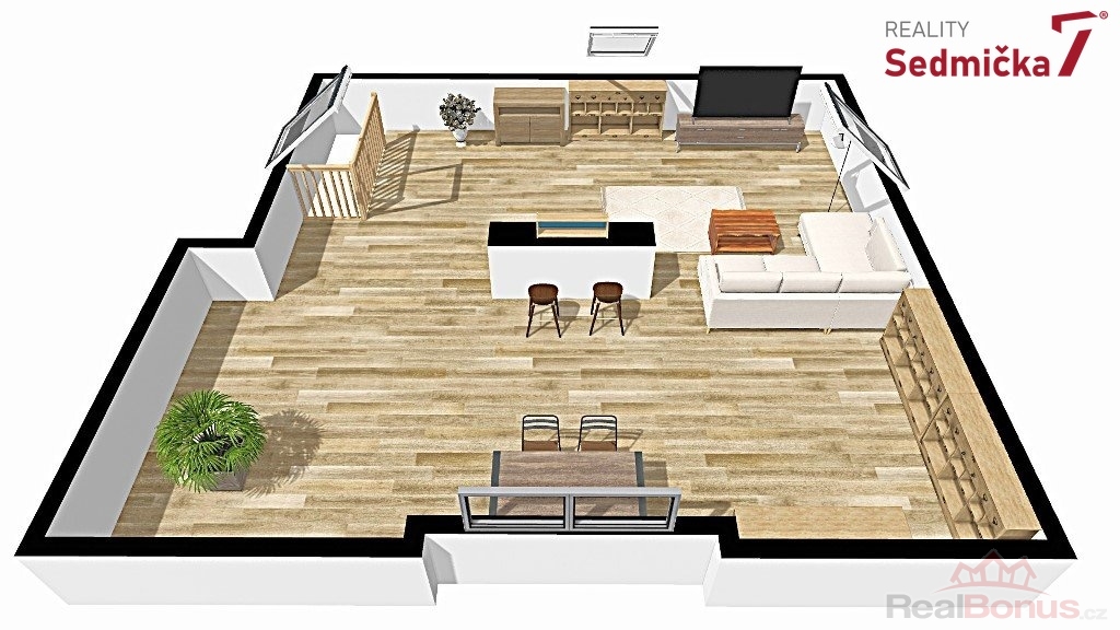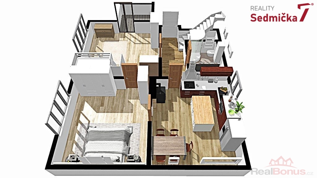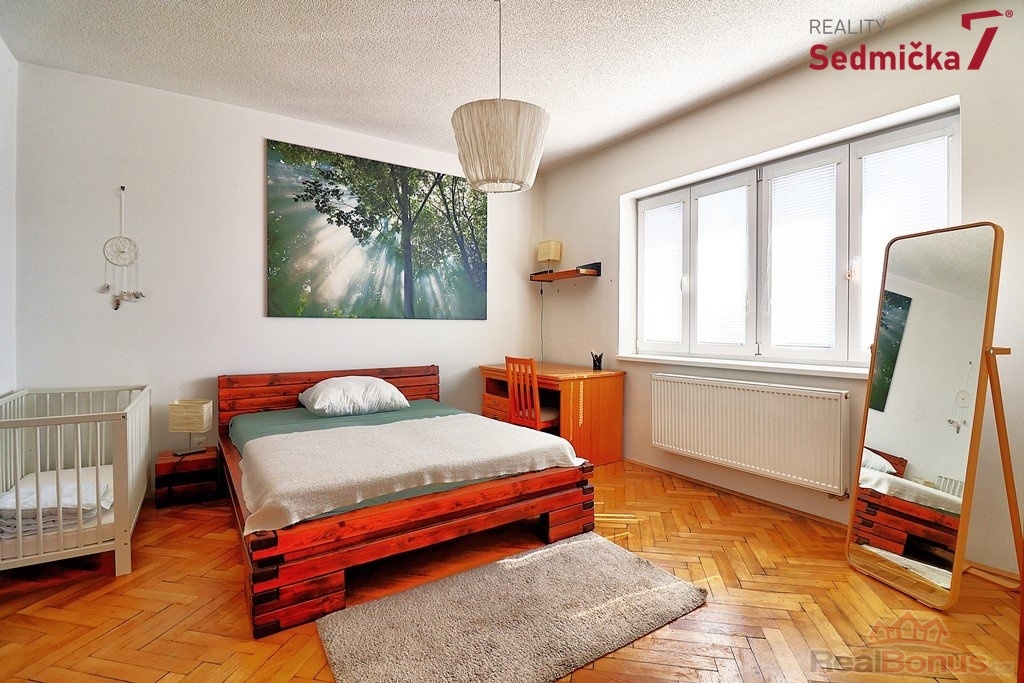 Byt je v 3. NP bytového domu se třemi byty. Má prostornou předsíň, kuchyň s jídelním koutem, dva pokoje, balkón, koupelnu s WC a v podkroví je velká jednoprostorová místnost.