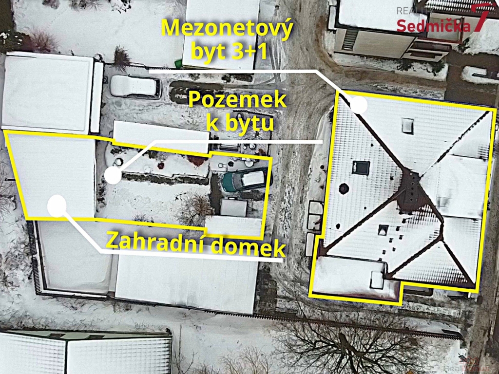 K bytu patří sklep, 1/3 společného sklepa, zahrada s dřevníkem, 2 parkovací místa, pergola s elektřinou, vodou, odpadem a kamny, majitel může navíc využívat 2 horní podesty na schodišti.