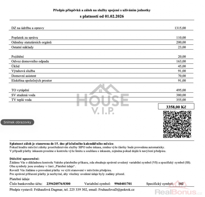 Měsíční poplatky činí cca 3 500 Kč pro dvě osoby + elektřina. SVJ (617) je dobře fungující a zajišťuje bezproblémový chod domu. Byt je aktuálně prázdný a připravený k okamžitému nastěhování.